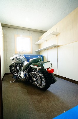 ・専用棚完備:バイク周辺のアイテムも整理できる便利な収納棚付き。